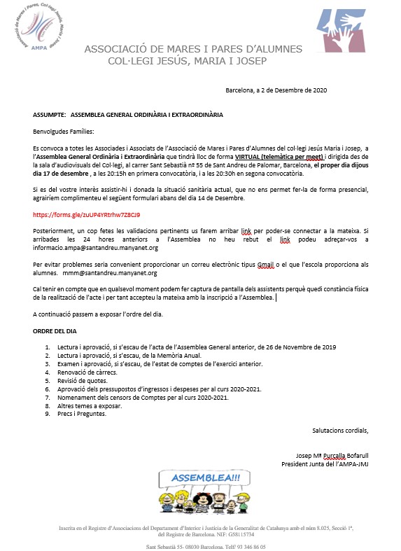 CONVOCATÒRIA ASSEMBLEA GENERAL ORDINÀRIA I EXTRAORDINARIA 2020